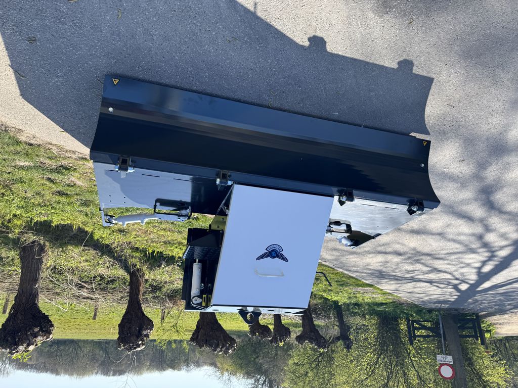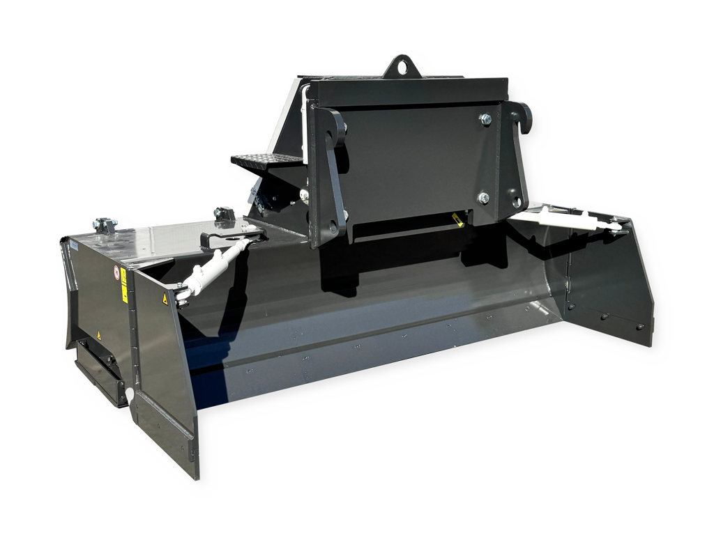 This version features a round dozer blade which is used for moving and spreading heaps of sand and soil. The leveller is also equipped with hydraulic doors and a manually adjustable bottom plate. When the Hardox blades on the sides wear down, the bottom plate can be adjusted. This leads to a much larger lifespan of the hardox blades before they need replacing.