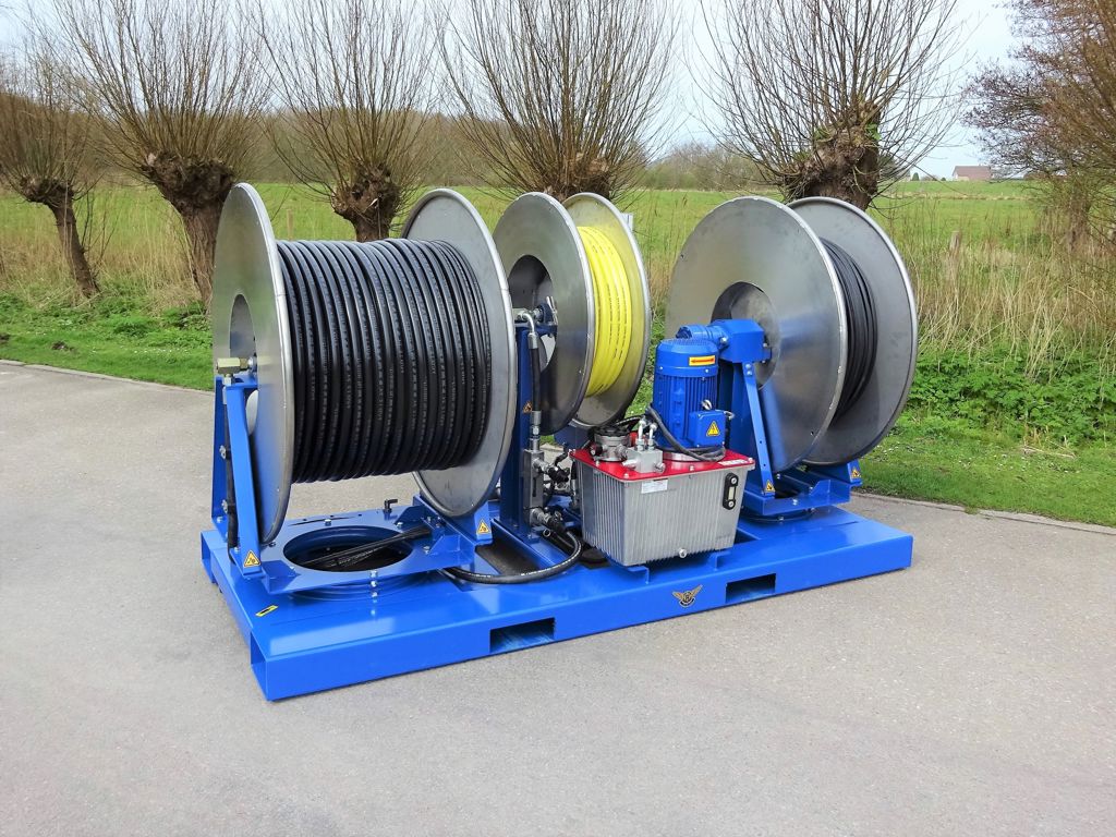 This reel unit has three hose reels for winding and unwinding of spray hoses. the two outer reels are pivotable by 90 degrees and provided with a swing lock. The reels are hydraulically driven by an electric hydraulic power unit. The winding speed is electronically controlled and can be set easily. The reels are provided with a freewheel for unwinding of the spray hoses. The Reel drums are made of stainless steel and fitted with swivel couplers.