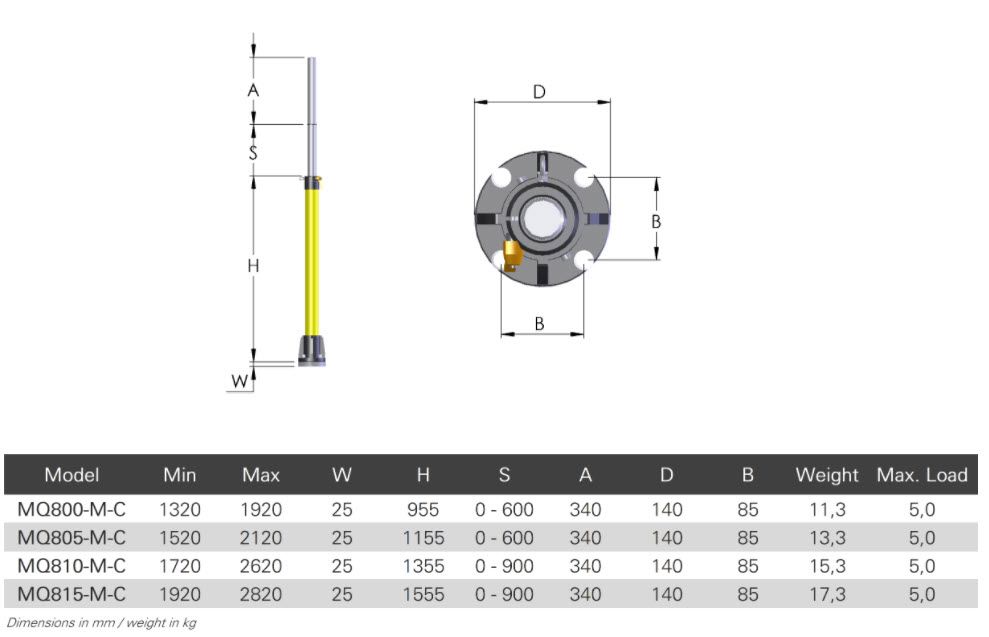 This type of receiver mast is telescopic and equipped with a 350 mm receiver mount. The total length of the mast is adjustable from 1800 to 2800 mm. The receiver can optionally be extended with a 5/8" threaded rod.
