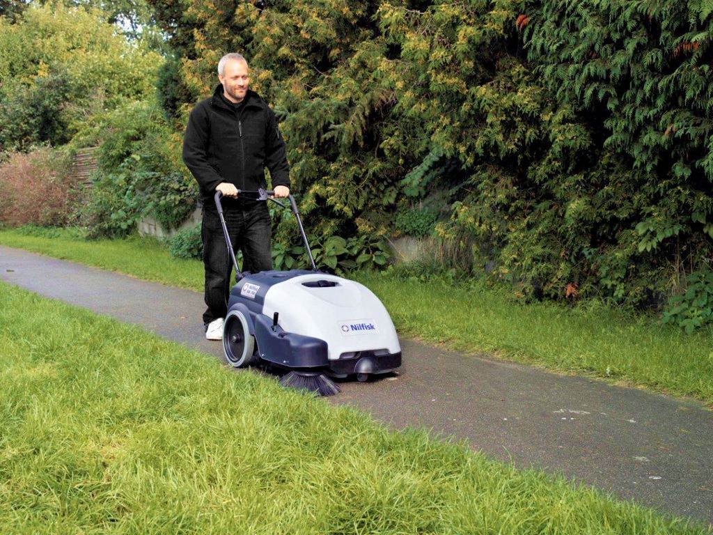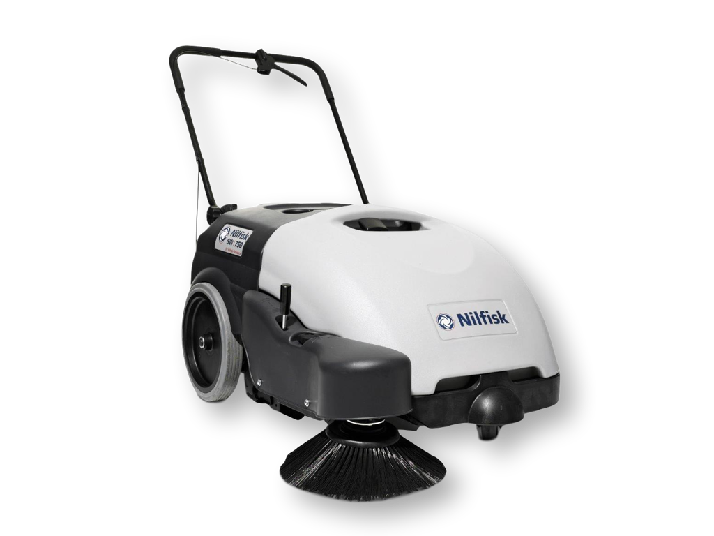 The Nilfisk SW750 is a battery-powered sweeper with filter cleaning and drive on the wheels, and is suitable for sweeping medium-sized spaces.