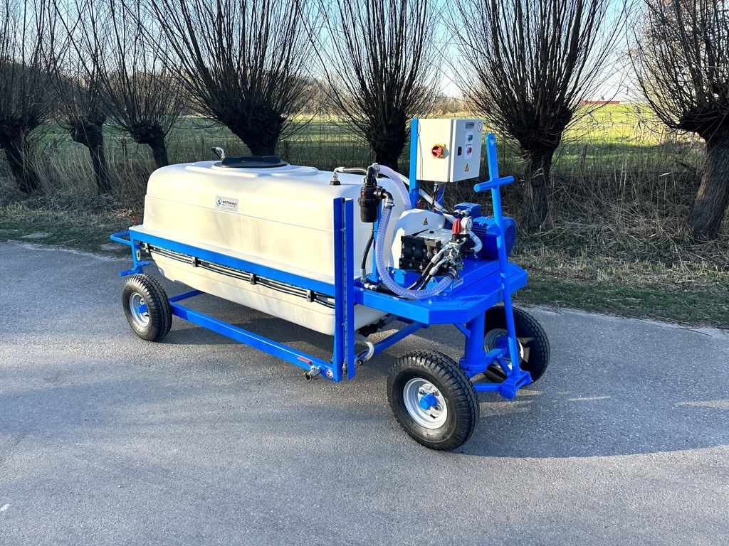 This spraying cart is equipped with a 1000 liters polyester tank and has a low-noise v-belt driven Imovilli P63 piston pump. The Imovilli P63 plunger pump is very suitable for, among other things, pumping highly soluble crop protection agents and water. There are four optional regulator valves mounted on the spray cart where each valve has a pressure of up to 15 bar. The spraying cart is equipped with a soft starter to reduce the starting flow and is equipped with a optional dry-running safety device. The tank can be filled from underneath to prevent foaming in the tank.