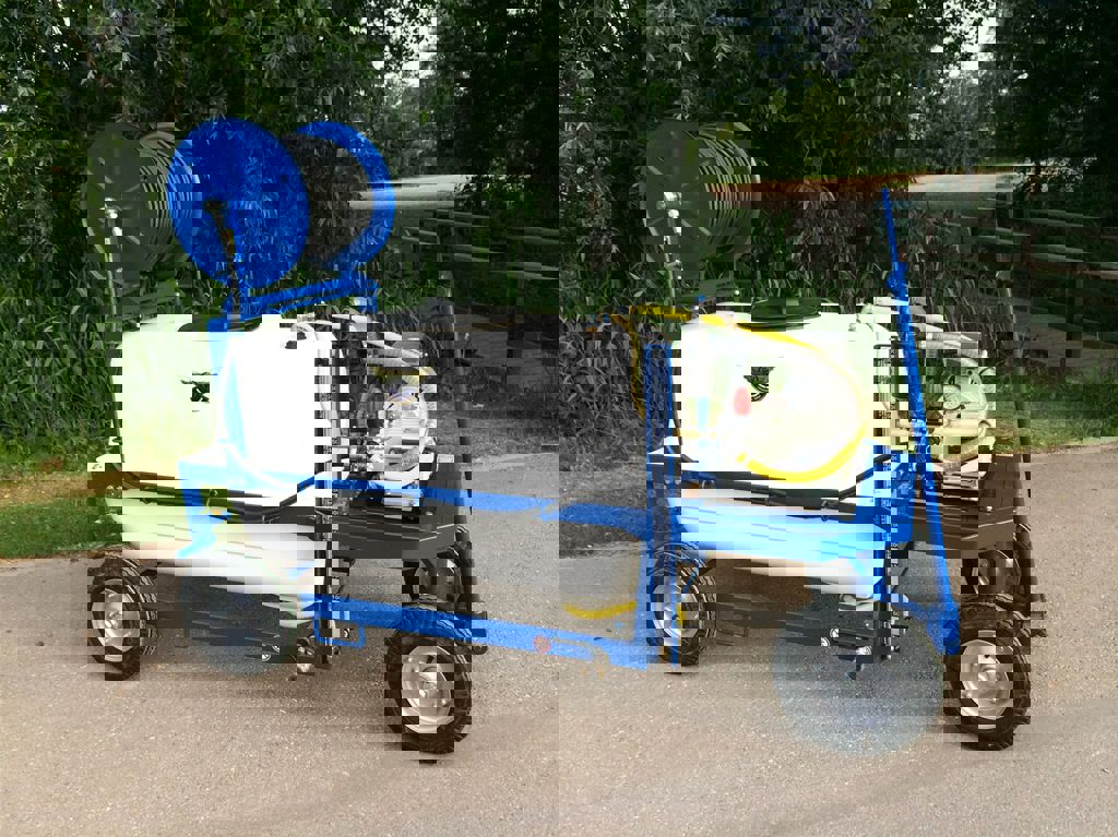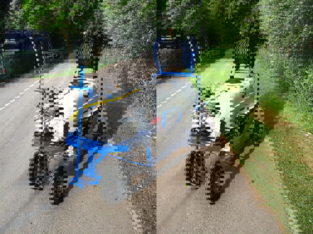 This spray trolley is equipped with a 1000 litre polyester tank, a direct coupled Imovilli P63 piston pump and a fixed manual hose reel.