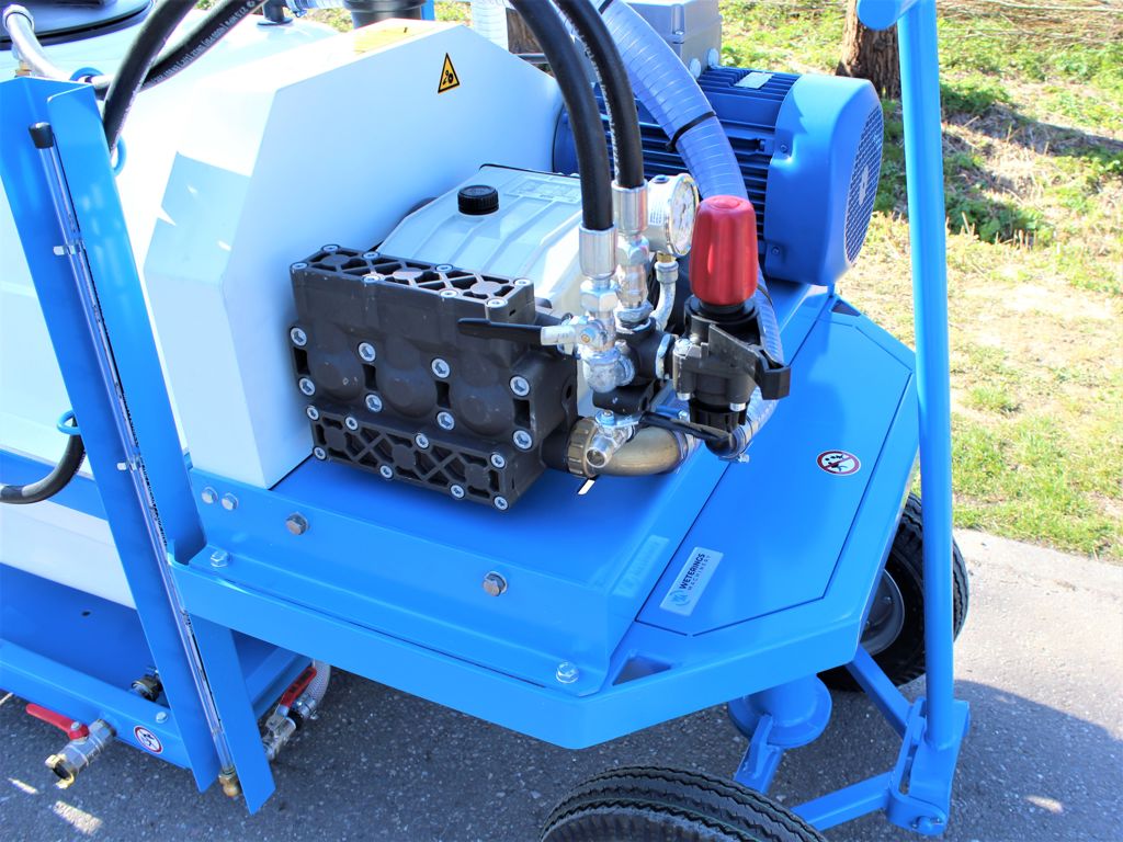 This spraying trolley is also equipped with an anti-swirl inlet, stirring injector, level gauge, parking brake, cord holder, cord guide and external suction filter above liquid level. The tank can be filled from below to prevent foaming in the tank.