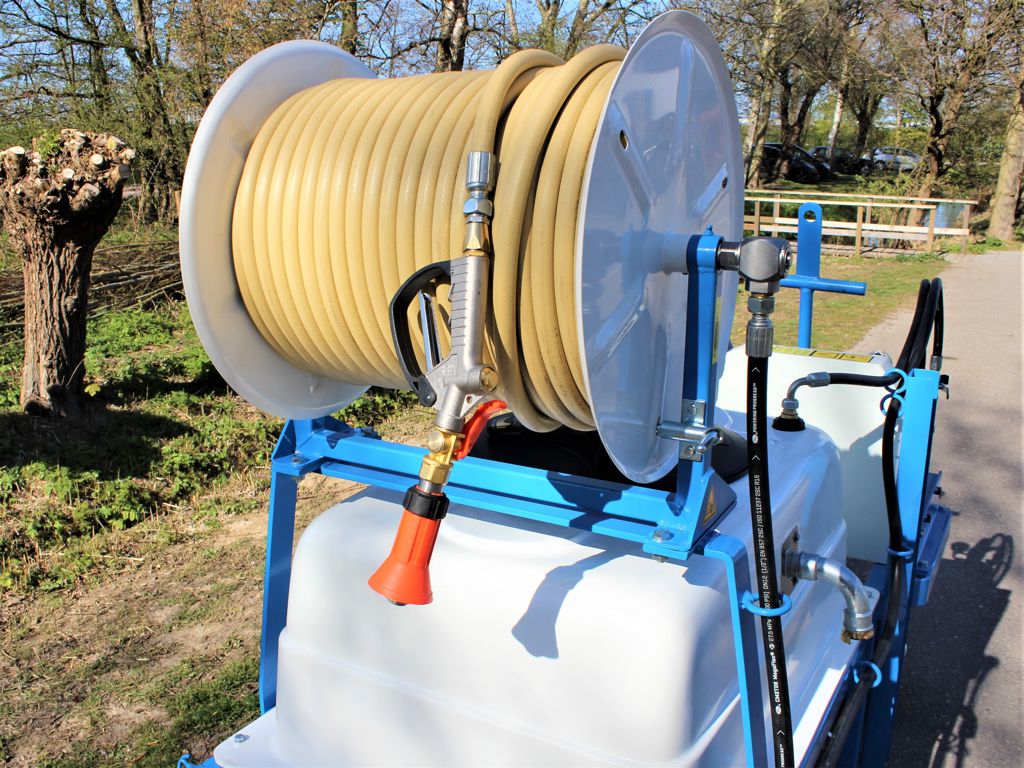 This spraying trolley is equipped with a 400-litre polyester tank and an Imovilli P93 piston pump. The tank is fitted with a float valve, allowing the tank to be filled continuously. For manual cleaning activities, we recommend a wear-resistant flexible kink-free hose such as the 1/2" Altiplus. The 450 mm wide hand reel offers sufficient space for approximately 85 metres of this spray hose. The hose reel is positioned above the tank, which leads to a compact sprayer unit.