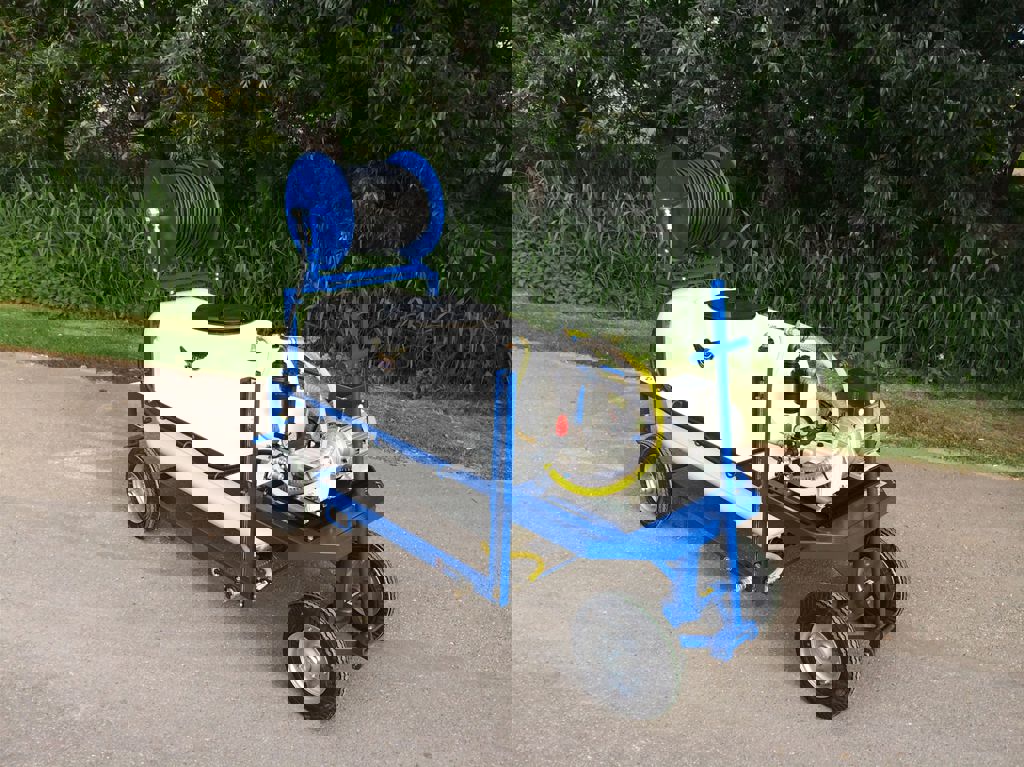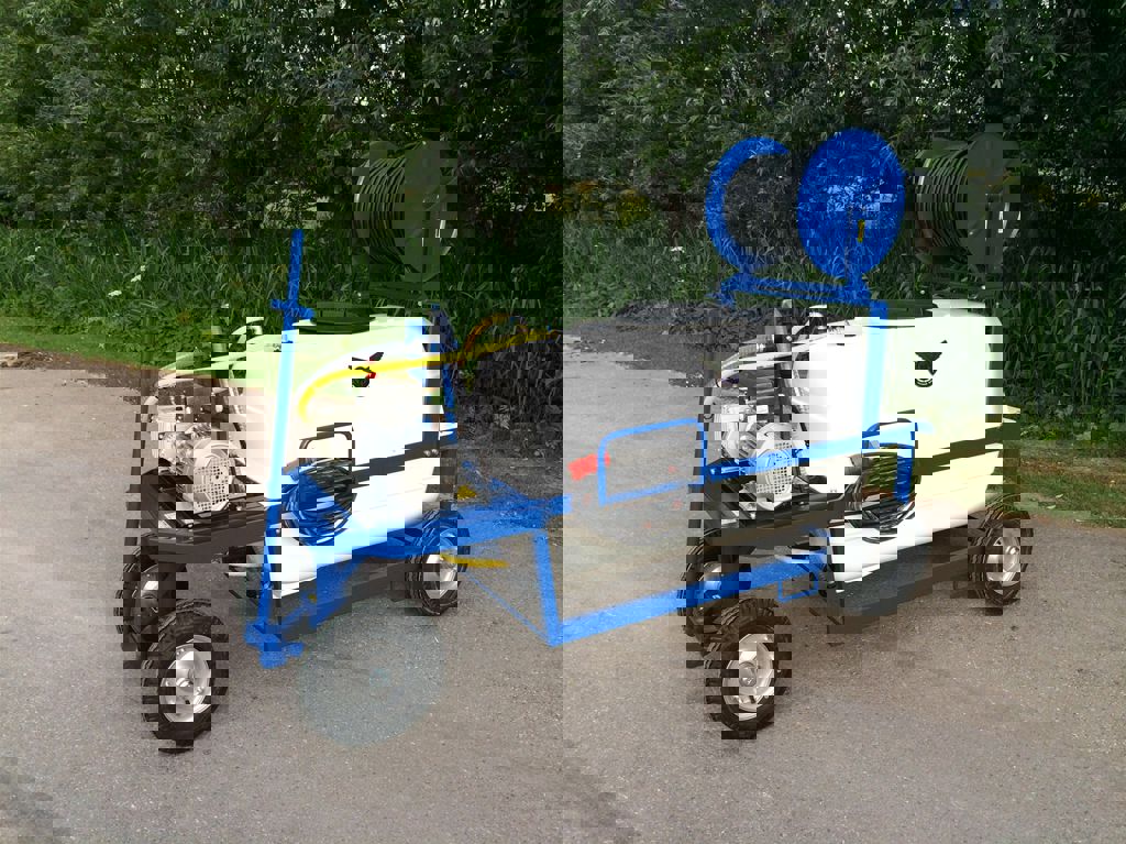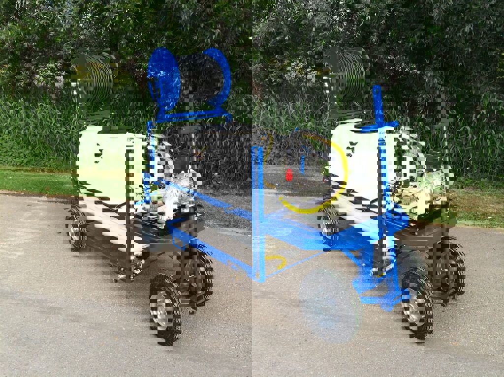 This spray trolley is equipped with a 600 litre polyester tank, a direct coupled Imovilli P63 piston pump and a fixed manual hose reel.