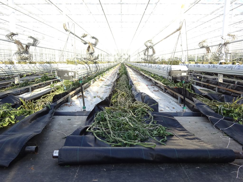 This Transport Fabric (crop clearance, foliage removal, mypex) is used for the mechanical removal of a.o. horticultural crops, substrates or ground cover. These transport fabrics are specifically woven to cope with the high forces of crop shredders and crop clearing machinery. The lengthwise direction of the crop clearance fabric is more densely woven than the width direction and the edges of the crop clearance fabric are reinforced. This structure causes the fabric to form a "gutter" when it is pulled in by a crop rotation machine. The material on the crop rotation fabric is therefore directed to the center of the fabric. Weterings transport fabrics have an extremely high tensile strength and a unique composition in order to guarantee reliability during the crop rotation.