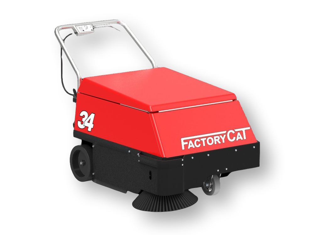 De Factory Cat 34 is een accu aangedreven veegmachine met filterreiniging en aandrijving op de wielen, en is geschikt voor het vegen van middelgrote ruimtes.