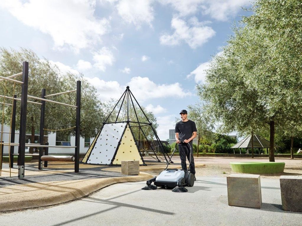 De borstel wordt aangedreven door de wielen zodra de veegmachine in beweging wordt gezet door de gebruiker. Overmatig stof wordt beperkt door het geïntegreerde filter en de grote vuilcontainer kan eenvoudig geleegd worden.