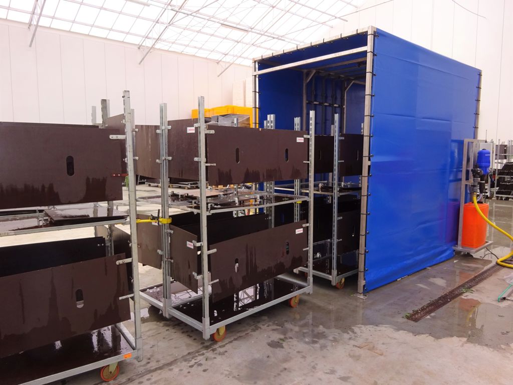Het frame is opgebouwd uit RVS316, wat bestand is tegen ontsmettingsmiddelen. Het frame is aan de binnenzijde voorzien van kunststof geleiders, waardoor de stapelkarren zonder schade door de ontsmetter worden geleid. Het frame wordt voorzien van een PVC zeil in de gewenst kleur, of transparant. De karrenontsmetter is eenvoudig te verplaatsen middels een heftruck.