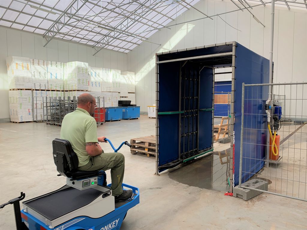 De transportkarren worden middels een elektrotrekker in de machine gereden. Het ontsmetten wordt afstandbediend gestart en gestopt door de bestuurder.