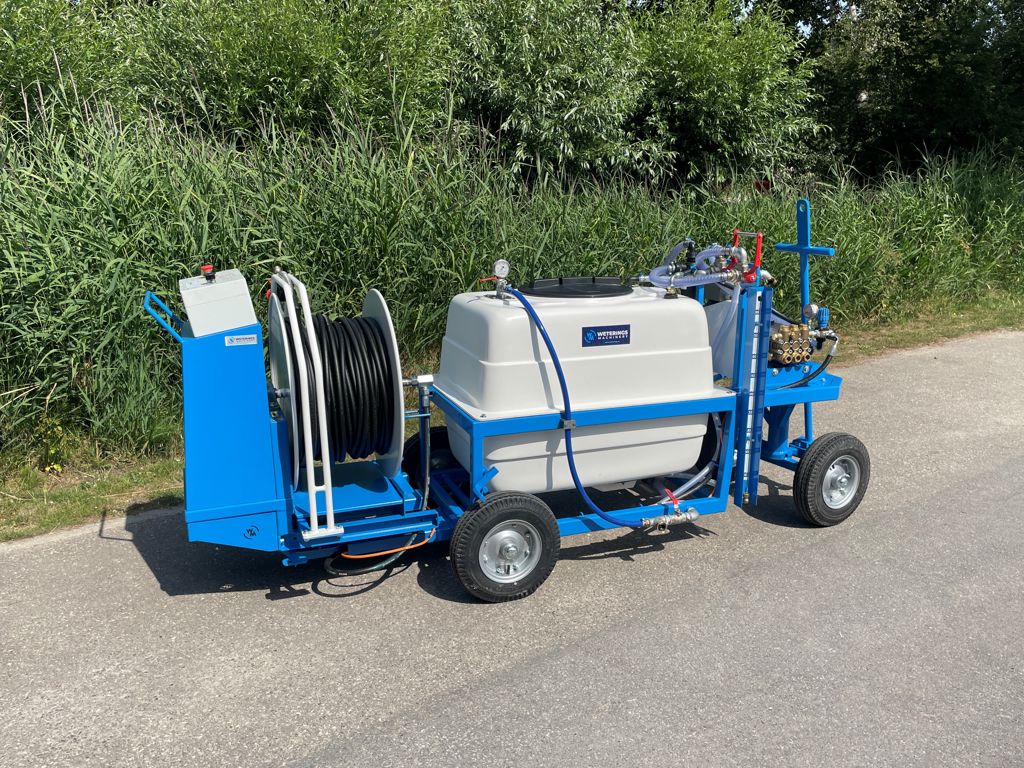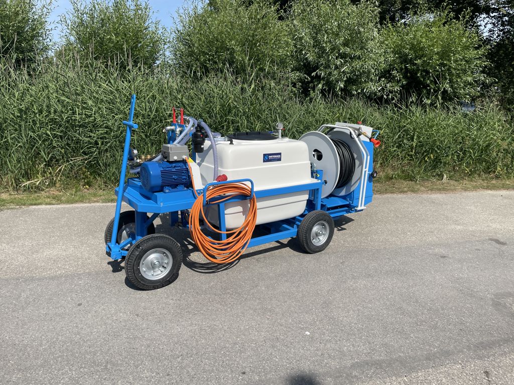 Deze spuitwagen is voorzien van een 400 liter polyester tank, Mazzoni GM50 plunjer pomp en een draaibaar, afstandbediend slanghaspel.