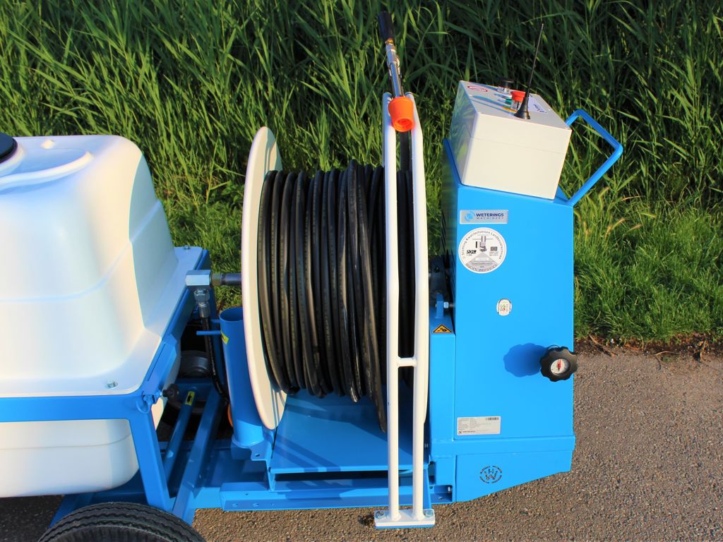 Deze spuitwagen is voorzien van een 400 liter polyester tank, Imovilli P63 plunjer pomp en een draaibaar, afstandbediend slanghaspel.