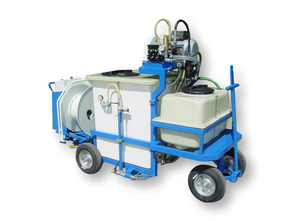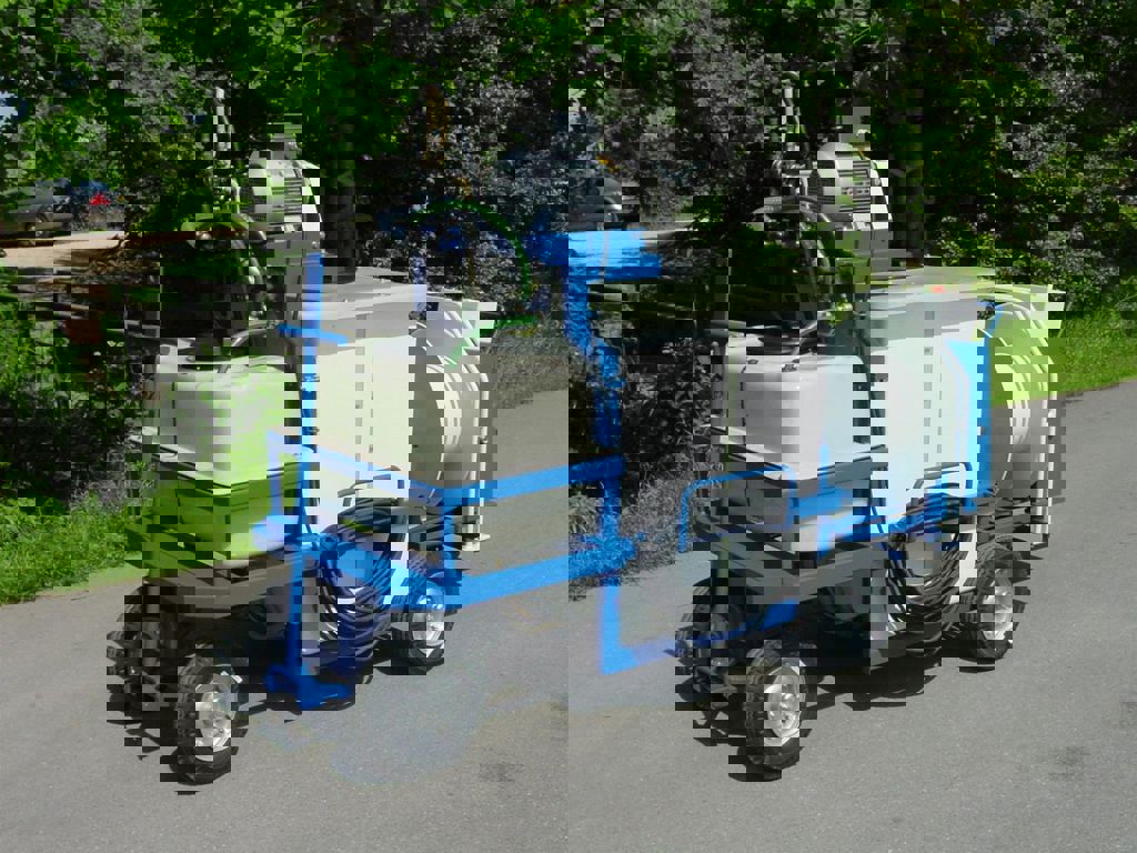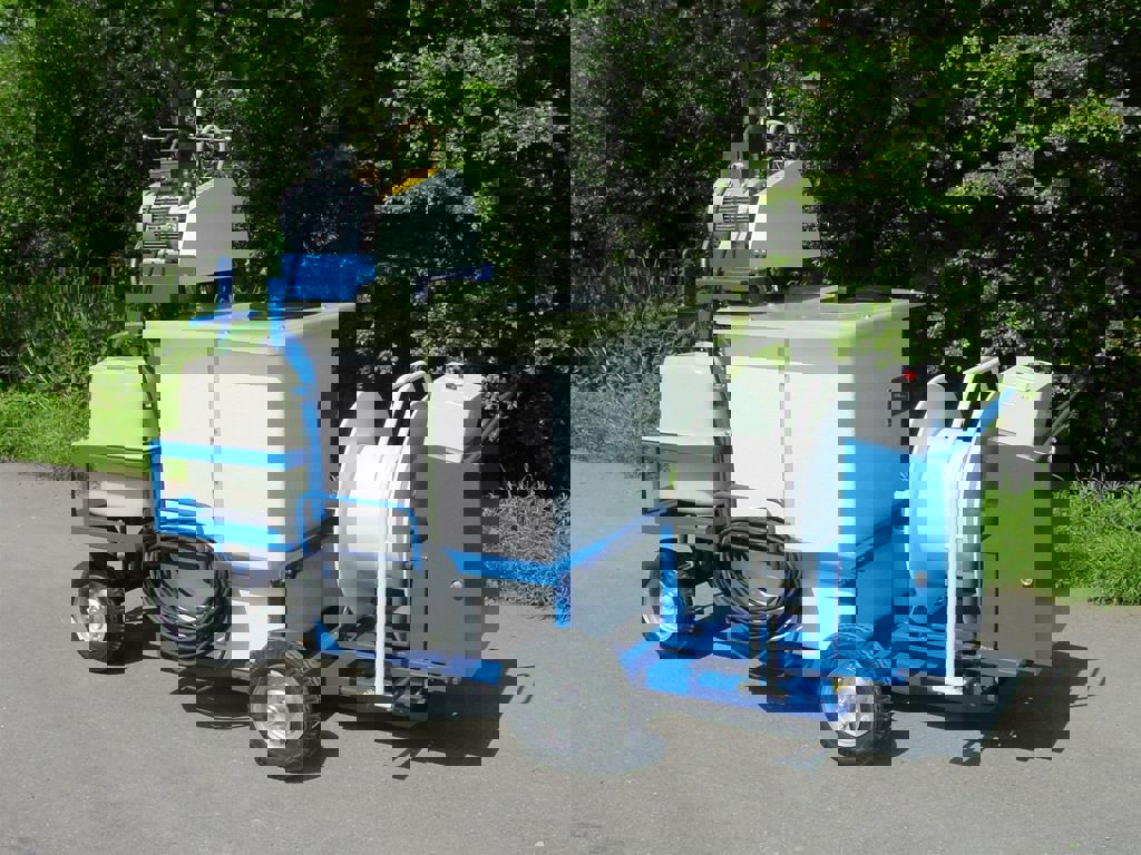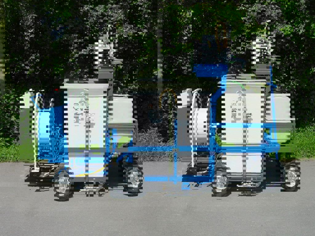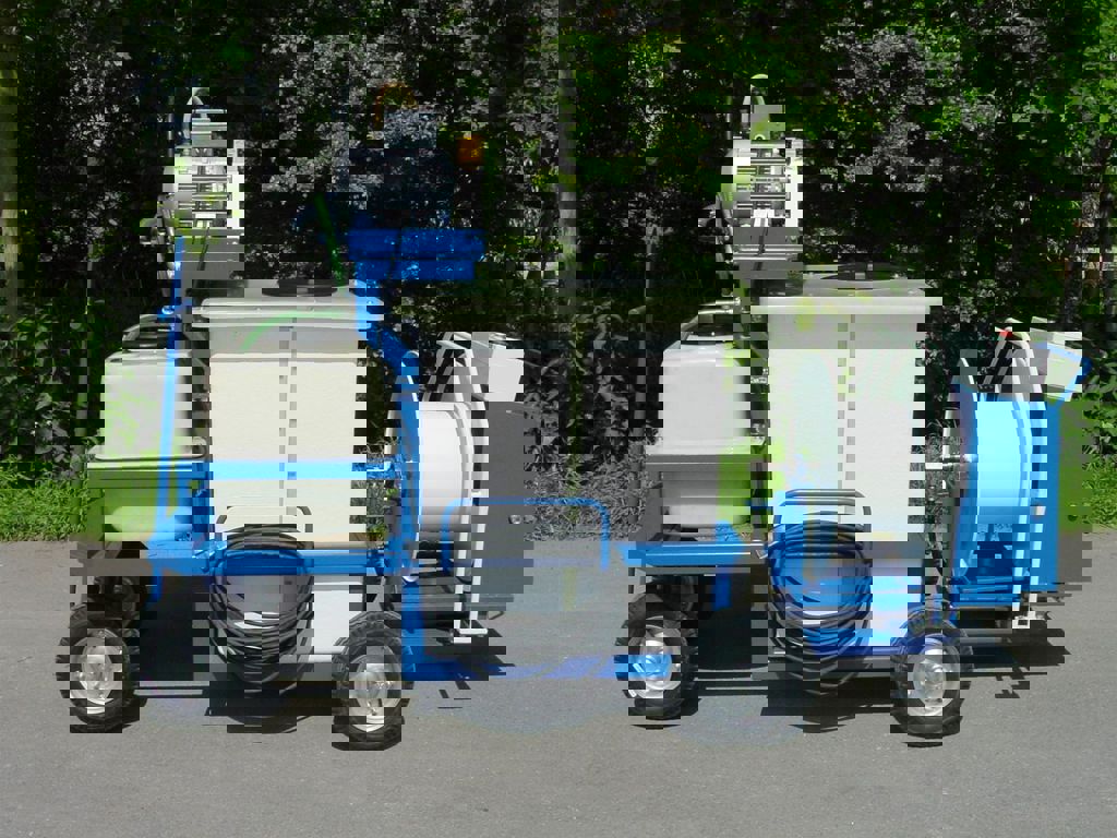 Deze spuitwagen is voorzien van een 600 liter kuip, 200 liter tank, een v-snaar aangedreven Imovilli P63 plunjerpomp en een vast WCR slanghaspel.