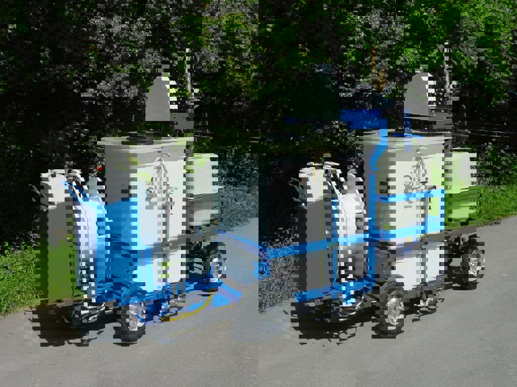Deze wagen is uitgerust met anti-kolk inlaat, roerinjecteur, peilglas, parkeerrem, snoerbeugel, snoergeleider en etern zuigfilter boven vloeistofniveau. De tank kan van onder gevuld worden om schuimvorming in de tank te voorkomen.