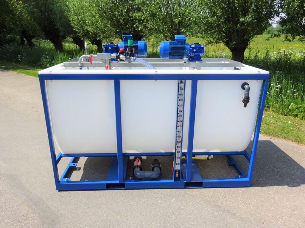 Deze krijttank met roermengunit is geschikt voor het mengen en roeren van diverse krijtmiddelen, coatings en reinigingsmiddelen voor het krijten, coaten en reinigen van kassen. De HDPE tank heeft een inhoud van 1700 liter en is voorzien van een stalen frame. De tank is voorzien van een inwendige vulindicator, een extern peilglas en twee afvoeren aan de onderzijde. De vulleiding kan centraal aangesloten worden op een gietleiding. De roermengers zijn op een RVS frame gemonteerd en voorzien van twee in hoogte verstelbare roerbladen. De roersnelheid kan traploos geregeld worden voor een optimale mengwerking. Deze unit is tevens voorzien van een fustenreiniger, waarmee de krijtemmers leeggespoeld worden.