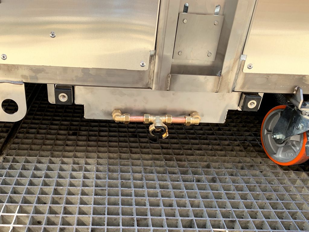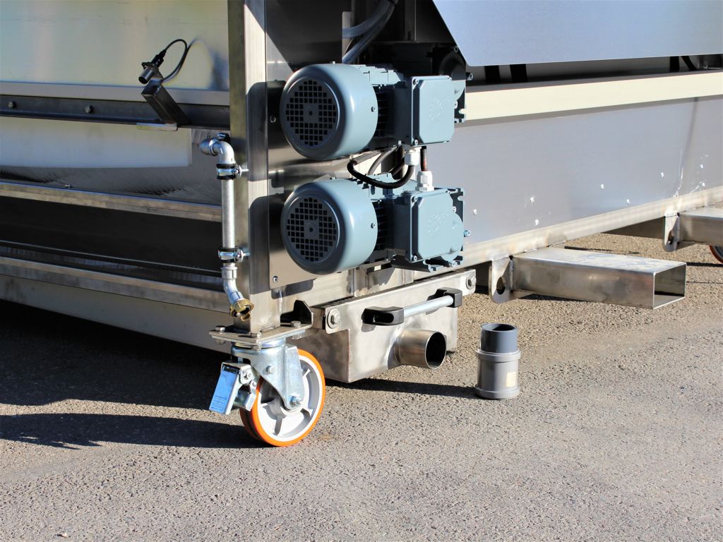 Deze opvangbak zorgt ervoor dat het vuile water wordt opgevangen en middels een afvoerslang naar een gewenste locatie kan worden geleid. De bak sluit de gehele onderzijde van de machine af. het vuile water wordt verzameld in een uitschuifbare opvangbak welke voorzien is van een grofvuilrooster. De opvangbak is voorzien van een Afsluiter met Geka aansluiting, waarmee de bak doorgespoeld worden.